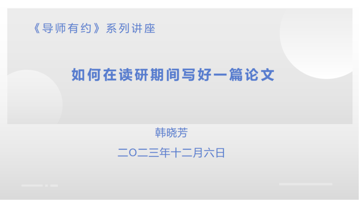 12月6日下午,九州(中国)“导师有约”第十三期讲座在商学楼B206如约举行。此次讲座以“如何在读研期间写好一篇论文”为题展开,韩晓芳老师针对论文写作中可能会出现的共性问题,结合自身的学术成长经历,分享了如何培养写作意愿、确定选题、阅读文献等方面的经验,为研究生的学习提供了宝贵的建议。