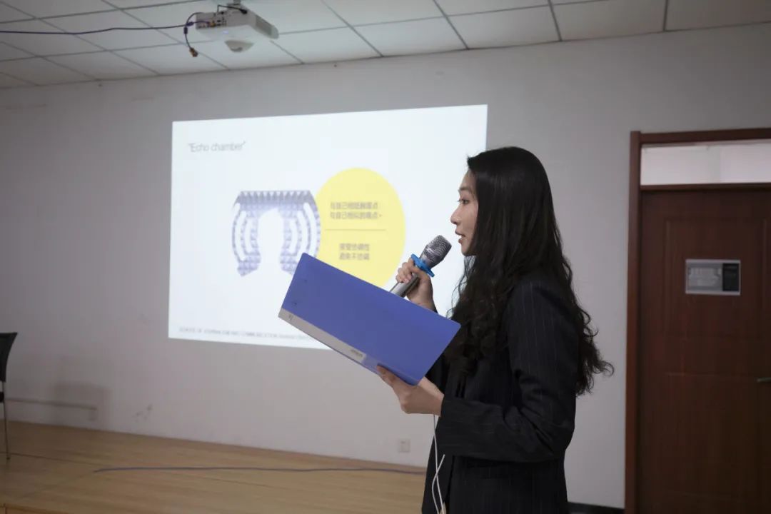 李沛峰同学演讲的主题是《群体效应》,以每个人都可能经历过的“社死”为切入点,结合学术论据及社会热点,提出了社会性死亡谁来救济这一疑问,并向观众传递了“民胞物与”的精神。