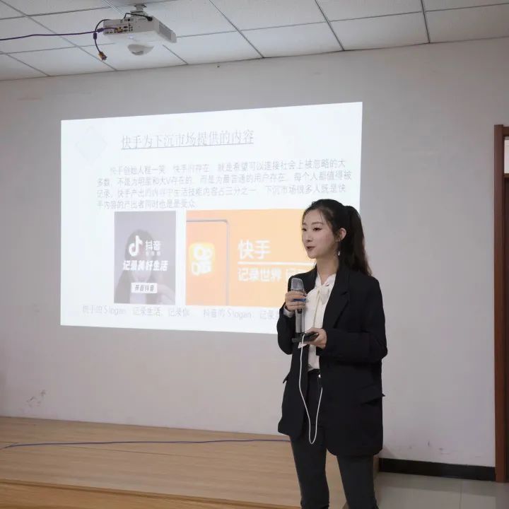 王含芳同学演讲的主题是《使用与满足——看快手在下沉市场中的用户》,采用快手这广为人知的APP,简要的阐释了下沉市场中受众的“使用与满足”。