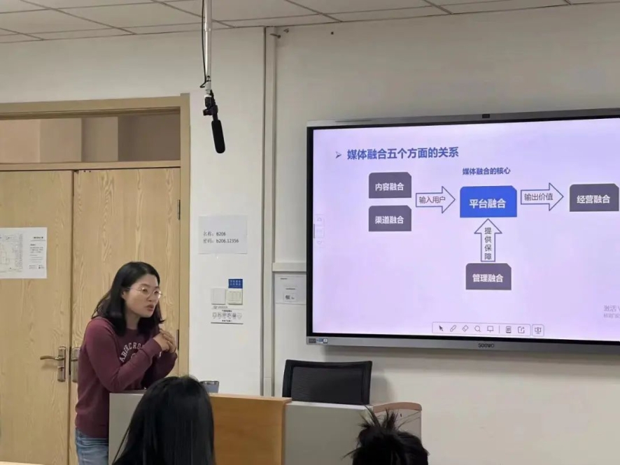 讲座伊始,郭慧老师梳理了有关媒体融合的出台文件,从国家顶层设计出发,介绍了媒体融合的内涵和纵深推进。随后,郭慧讲解了媒体融合的核心,即“内容融合”“渠道融合”“平台融合”“管理融合”和“经营融合”五个方面的关系。此外,郭慧老师强调,尽管内容输出价值与变现能力相关,但在媒体融合过程中主流媒体仍要明晰自身与平台的不同之处,以公益为导向,维护公众知晓权。