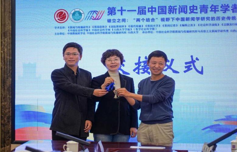 在闭幕交接仪式上,山西大学新闻与传播学院院长庞慧敏、暨南大学新闻与传播学院副教授王明亮和中国社会科学院新闻与传播研究所副研究员叶俊,共同完成了论坛吉祥物的交接。王明亮副教授代表第十二届中国新闻史青年学者论坛承办单位发表致辞,诚邀与会学者来年相聚广州。