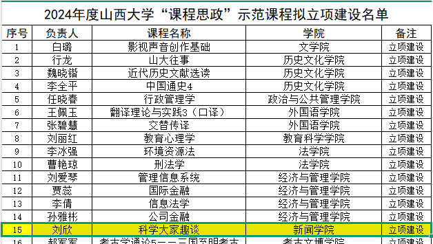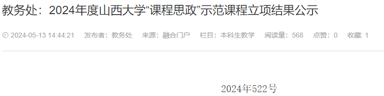 近日,山西大学教务处发布了2024年度山西大学“课程思政”示范课程立项结果,我院有2门课程获批立项,分别是《科学大家趣谈》《外国新闻传播史》。