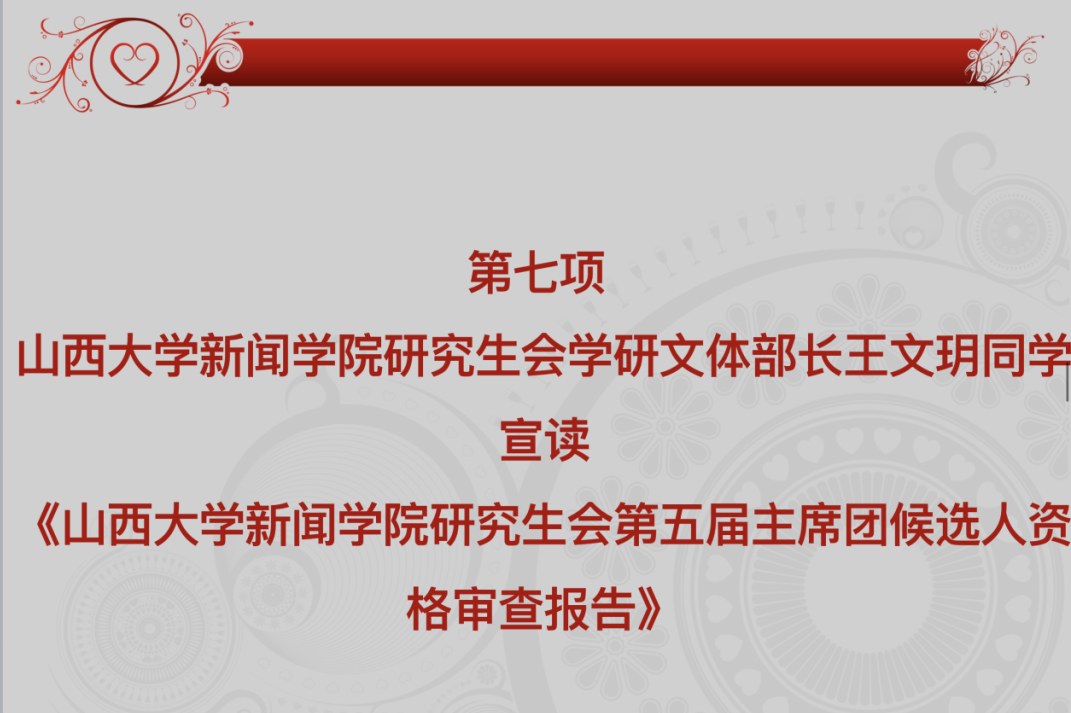 随后由研究生会学研文体部部长王文玥同学宣读《九州(中国)研究生会第五届主席团候选人资格审查报告》,确认四名候选人的候选资格合规有效。