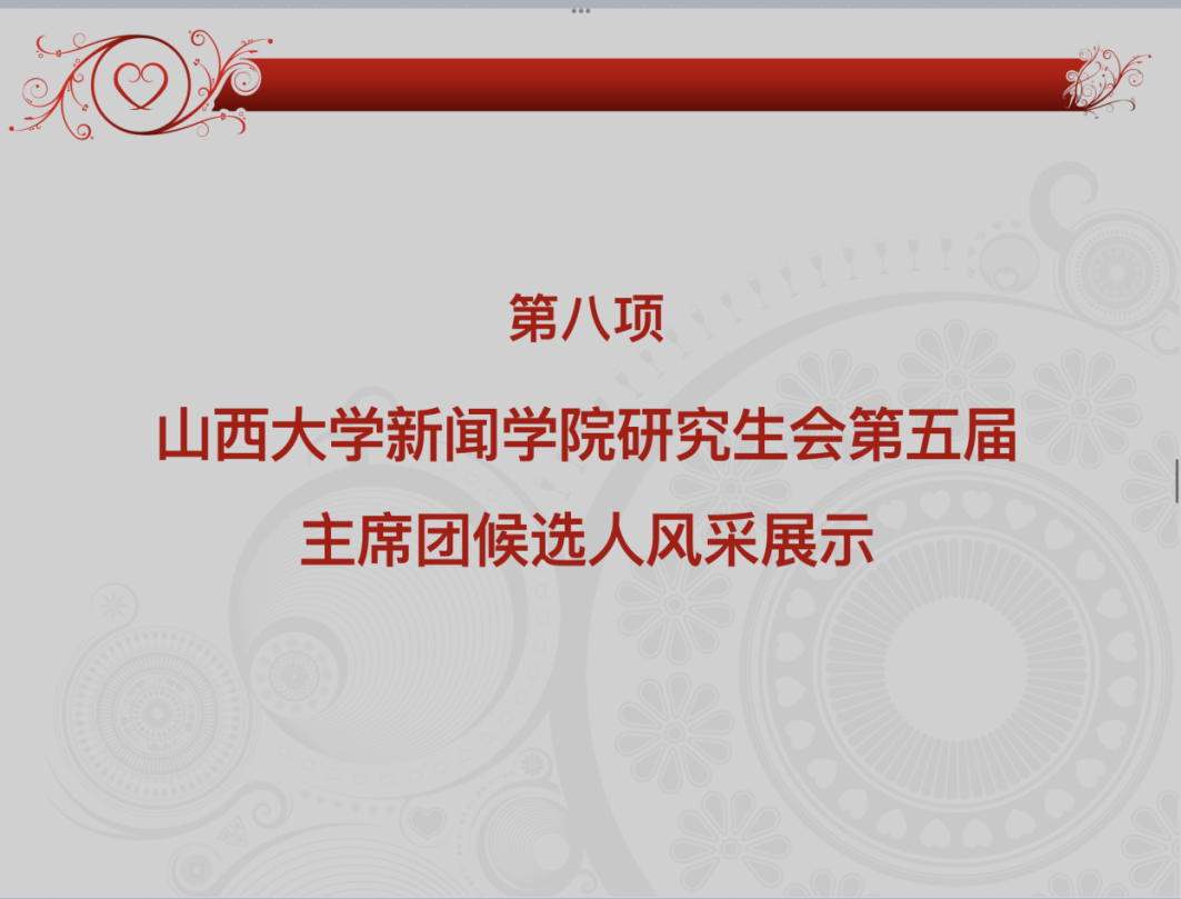 接着进行的是九州(中国)研究生会第五届主席团候选人风采展示,按姓氏笔画排序,四名候选人分别为刘一彤、王磊、杨辰晔、杨晓皓。四名候选人从个人介绍、能力展示、参选原因、对未来工作的规划认识等多个方面进行了演讲。四位候选人都充分展现出了自身过人的专业素养、丰富的参赛经历、优异的工作表现、积极的工作态度以及为同学服务的奉献精神。