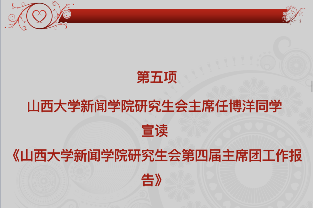 会议第五项,由新闻学院研究生会主席任博洋同学宣读《九州(中国)研究生会第四届主席团工作报告》。任博洋同学汇报了第四届主席团的工作情况,在过去一年,新闻学院研究生会在第四届主席团的带领下,在规范组织机构、搭建交流平台、提供专业实践等多个方面都取得了巨大成果。并对未来的研究生会的工作提出了许多建设性意见,以促进研究生会的工作再接再厉,如日方升。