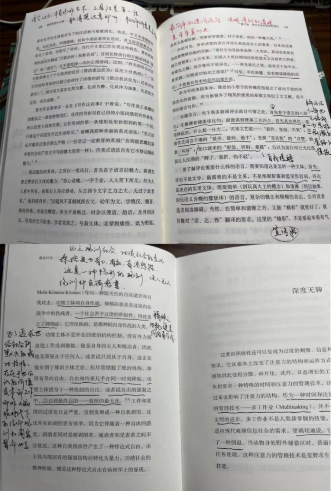 第一种是发散思维,即针对某句话延伸出思考内容,而不是仅仅围绕话题本身。有些书之所以值得反复读,恰恰就是为了捕捉到每一次延伸思考金句、案例后偶然迸出的火花。例如,韩炳哲《透明社会》的《展示社会》一章中有言“‘膜拜价值’取决于存在,而非展览”,多数人会直接想到“距离产生美”;还可联想至《蒙娜丽莎》被大量复刻印刷,甚至登上文化衫上,是否丧失灵韵;再联想到强调以“透明性”自救的新闻业,很难不担心过度公开采编流程是否会消解媒体的权威性,肢解受众的膜拜心理。这样,稍加发散,便能让短短一行黑字丰满多彩起来,再贴近自己的专业展开思考,可能就诞生一篇小论文。读书就是为了以思维代替赤足,帮自己远航,故而不必吝啬发散思考和无边际的精神漫游。02第二种是动态思维,这个思维是我在读曹操传记时学到的,彼时的阿瞒也是如此注解《孙子兵法》的。囿于年轻人的学术积累、阅历经验,我们无法在初次看书、初次笔记的时候就写下入木三分的见解。这要求笔记者及时记录下此刻所思所想、所伤所感后,留足书写空间,方便日后重读时更正、补充或延续原初笔记。这样一来,也可以进行纵向的历史记录,展现自己知识想法的有机成长过程。日后当作个人的思想简史来看,也是美事一桩。当然,每一次修订笔记时最好更换用笔颜色,以作区分。03第三种是形象思维,即以直观形象和表象为支柱的思维过程。具体说来,就是边读书边建构本书叙事说理的框架,明了各章所担纲的表述任务,清楚各节分饰的说理角色,拆解段句间的逻辑脉络和演进节奏。在此过程中,笔记者可以各显神通,擅于绘画的可于空白处素描一幅章节框架图,长于想象的可意会出一架具象模型帮助理解内容。以福柯的《疯癫与文明》为例,我们不妨假想DC宇宙下的哥谭市,是否像是病人们各怀鬼胎又同受压迫的疯人院,谈及“全景监狱”时不妨想象在黑暗的环形监狱上方,有只巨型眼睛,瞳孔凸出,眼白布满血丝。如此想象画面,不寒而栗之感会帮助你更好理解福柯那天马行空般的学究语言。