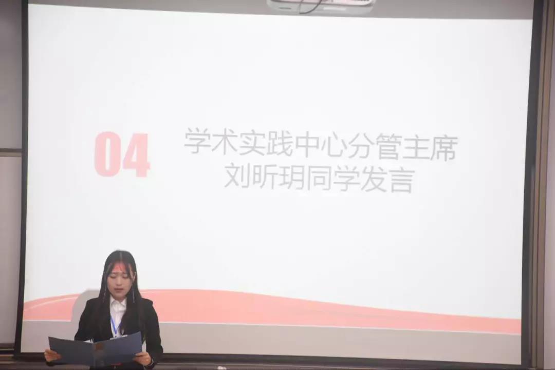 刘昕玥首先对出席大会的领导,老师,所有学生会成员表示了欢迎。接着分别就下设的学术部与实践部提出了要求。对于学术部,要求策划组织暑期系列活动来表达对改革开放四十周年献礼的心意,提高同学们的思想政治觉悟,增强品牌活动建设,开展一院一品的特色品牌活动以提高新闻学院的影响力并提高大家参加活动的积极性。她也要求学术部从敬一丹老师讲座中总结活动经验,以用于之后的活动参考等。对于实践部,她要求积极主动拉取赞助,将拉赞助从临时性转变成常规性的工作,实现走出去拉赞助的计划。她还要求成立志愿团队,拓展服务范围,让更多的同学参与其中,体验服务的价值。