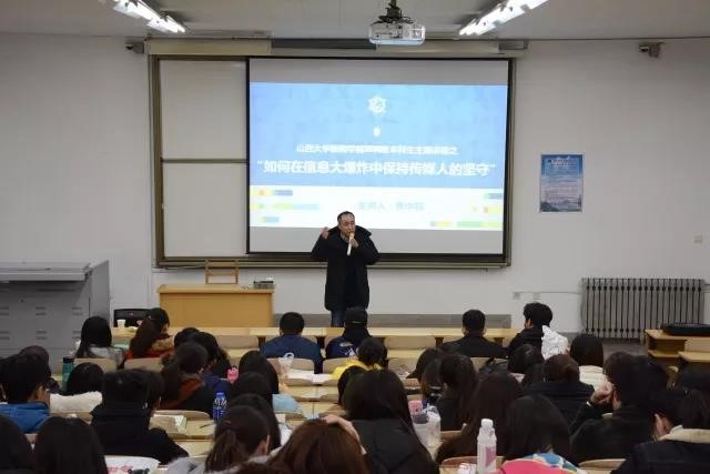 讲座中,焦中栋老师以自己在山西大学求学时期的青葱岁月为引,结合自己的回忆和当代大学生情况提出了“什么是信息大爆炸?”、“传媒人应该坚守什么?”等问题,并作出解答与阐释。他从国家政治层面、意识形态斗争等角度,深入分析了近年来发生的“魏泽西案”、“于欢案”、“雷洋案”、“红黄蓝幼儿园事件”等一系列的社会热点事件,讲述事件真相始末,挖掘事件产生原因,剖析人物背后心理,在揭示媒体舆论导向变化规律的同时,号召同学们面对社会热点问题要秉持正确态度,保持客观冷静,结合常识、深入思考,从而正确判断舆论报道的真伪,做到在事实明晰之前不跟风发表过激言论,不造谣、不传谣。