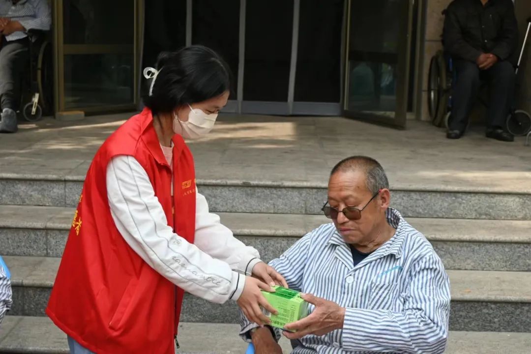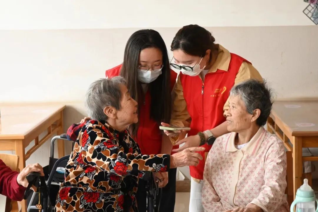 志愿者们围坐在老人身旁,与老人亲切交流,分享自己的大学生活以及有趣经历,他们用朴实的行动表达对老人的关爱,认真倾听老人们讲述过往的艰苦岁月,平日里清净的养老院一下子变得热闹起来。
