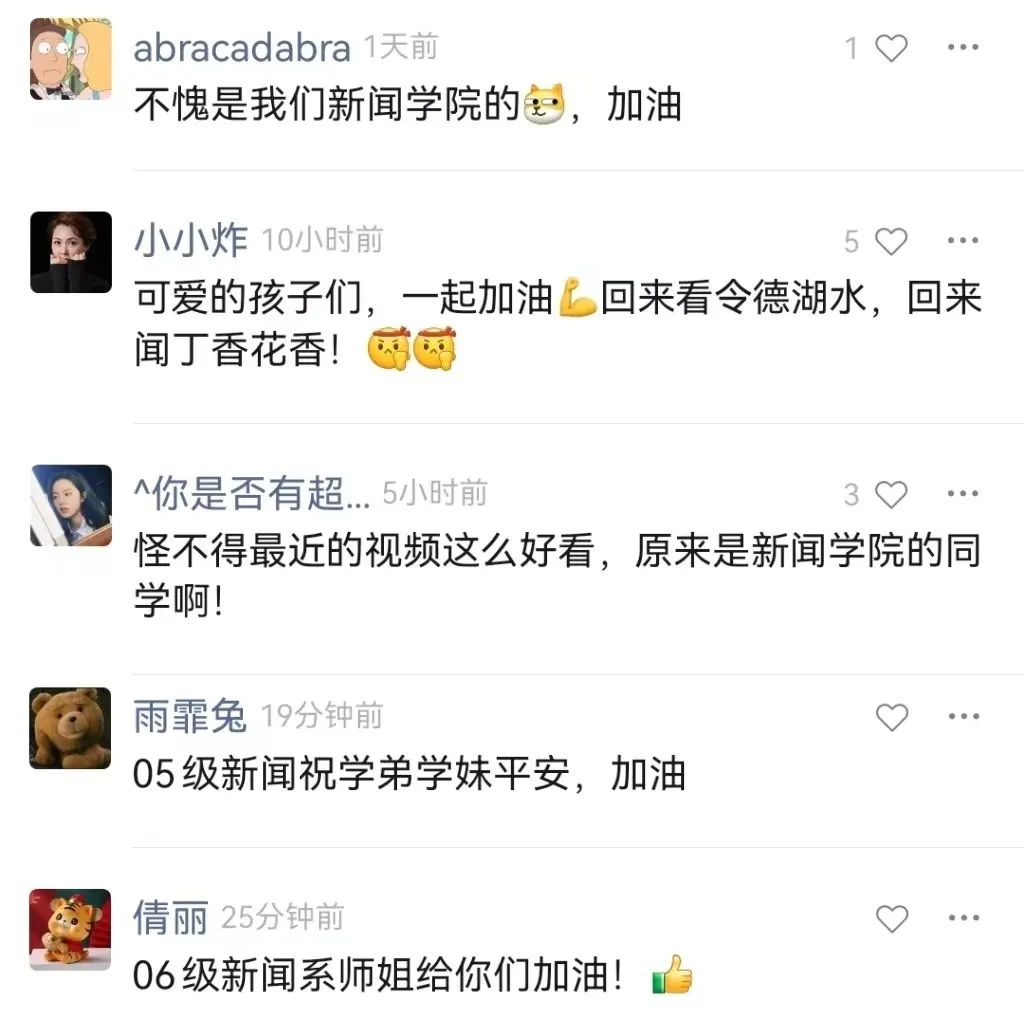 该视频发布后获得了很多网友的关注,来自各方的鼓励涌入评论区:“同是山大在校生,期待我们再相逢!”“05/06级学长学姐给学弟学妹加油!”“可爱的孩子们,一起加油!回来看令德湖水,闻丁香花香!”受其影响,不少与陶致桦熟识的师生也纷纷将遇到的感人故事记录下来,连夜将视频素材发给他。“手机一直在响,大家发来了很多的山大抗‘疫’瞬间。事实证明,这是一座充满爱与希望的校园。”大家希望让更多人看到这些“瞬间”,传递这份温暖人心的力量。