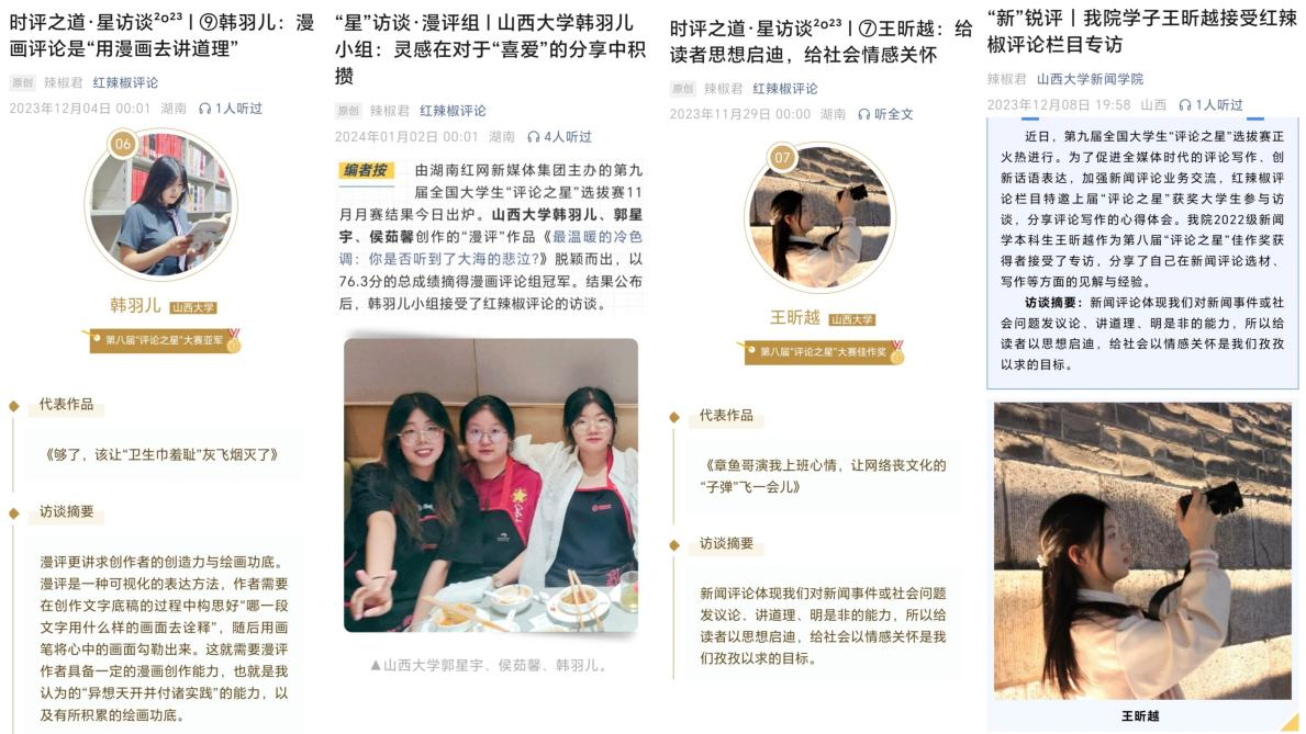 在此期间,新闻学院涌现出一批具有较强写作水平和创作能力的学子。2022级新闻学专业的韩羽儿同学在两届“评论之星”比赛中获得亚军和一等奖、团体二等奖,在2022-2023年的“青椒计划”比赛中,三次获得“月度优胜作者”,在2022-2023年的月度“评论之星”选拔赛中三次获得“月度之星”,多次接受红网“星访谈”。她采用长篇漫画评论的形式,用漫画“讲道理”,以“不拘一格”式的创作构想和细腻深入的笔触勾勒出一个个社会矛盾问题,引人深省,形成了自己独特的漫评风格。同为2022级新闻学专业的王昕越同学也在第八届和第九届全国大学生“评论之星”选拔赛”中分别获得佳作奖和二等奖,在2023年1月红网“青椒计划”评论比赛中获得文字组“月度优胜作者”,参与红网首届时评“椒”流会并接受红网“星访谈”。谈到自己在评论写作过程中的感受,她说道:“新闻评论写作是一个需要深思熟虑的理性思考过程,而课堂就赋予了我坚定的理论底气和表达勇气。课堂上的案例分析和理论讲解,为我们提供了宝贵的写作和投稿经验,这些对我们而言都极具价值。”正是在“新闻评论”课上的理论指导和实践摸索帮助了她在评论写作的路上不断取得进步。